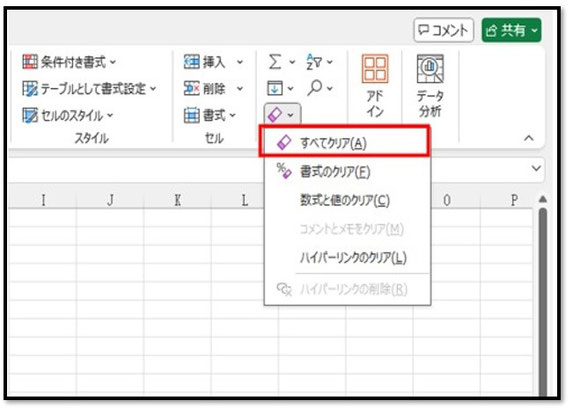 林パソコン教室ブログ · 25日 8月 2025 Excelですべてのデータを削除 1・削除する範囲(下記の表の場合はセルA1からE7)をドラックして選択します。 2・「ホーム」タブをクリックし、「編集」グループの「クリア」ボタンの右側の下向き三角をクリックします。 3.表示された一覧から「すべてクリア」をクリックします。 4.すべてのデータを削除することができます。 tagPlaceholderカテゴリ: Excel