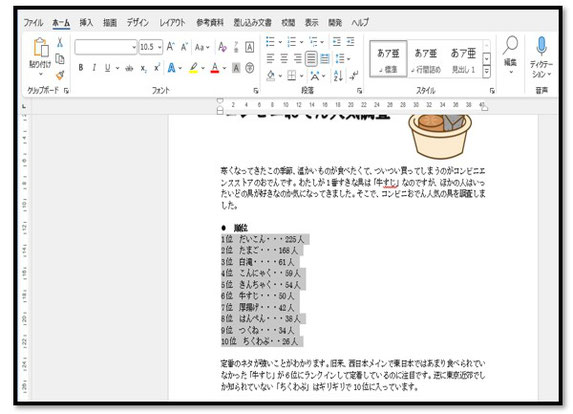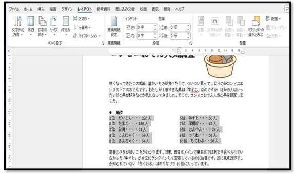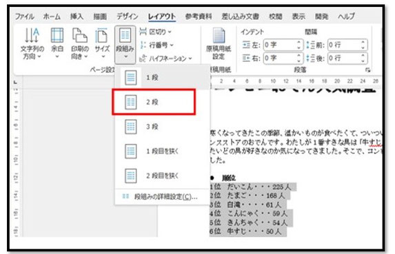 林パソコン教室ブログ · 28日 8月 2025 段組みの設定(Word) ワードでは、文書全体や特定の部分だけを簡単に段組みにすることができます。文章を途中で折り返し、2段、3段にするレイアウトです。 1・下記の文書の順位に2段の段組みを設定します。段組みを設定する文字列をドラックして範囲選択します。 2・「レイアウト」タブをクリックし、「ページ設定」グループの「段組み」をクリックして選択します。 3・表示された画面で「2段」をクリックします。 4・2段の段組みを設定することができました。 tagPlaceholderカテゴリ: Word