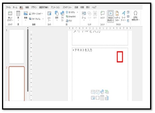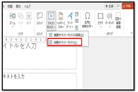 林パソコン教室ブログ · 05日 9月 2025 PowerPointで縦書きテキストボックスの挿入 1・「挿入」タブをクリックします。 2・「テキストボックス」をクリックします。 3・表示された画面で「縦書きテキストボックス」をクリックします。 4・縦書き入力したい位置にカーソルを持っていき、クリックします。縦書きのテキストボックスを作ることができます。 5・ボックス内に文字を打ち込めば縦書きテキストボックスの挿入完了です。 tagPlaceholderカテゴリ: Powerpoint