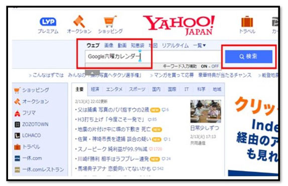 1・ブラウザを起動し、検索ボックスに「Google六曜カレンダー」と入力し、「検索」ボタンをクリックします。