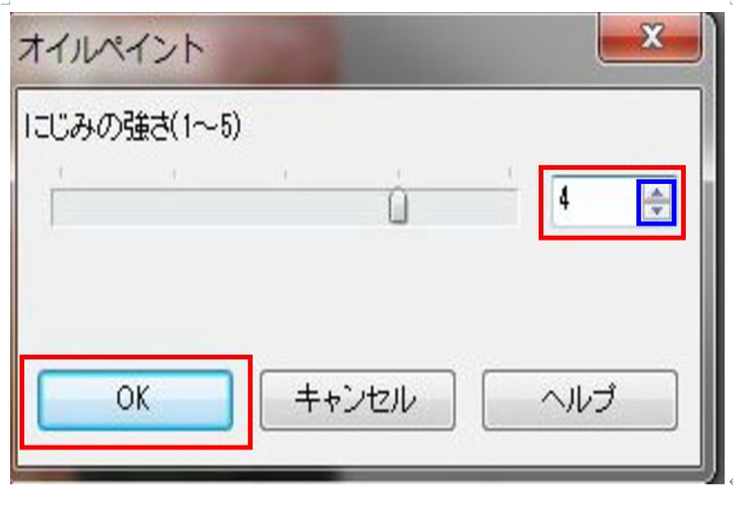 3・「オイルペイント」ダイアログボックスが表示されます。今回は「にじみの強さ」を「4」に設定します。ボックス内に数値を直接入力するか、ボックス右側の三角ボタンを利用して指定します。最後に「OK」ボタンをクリックします。
